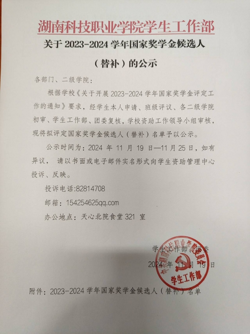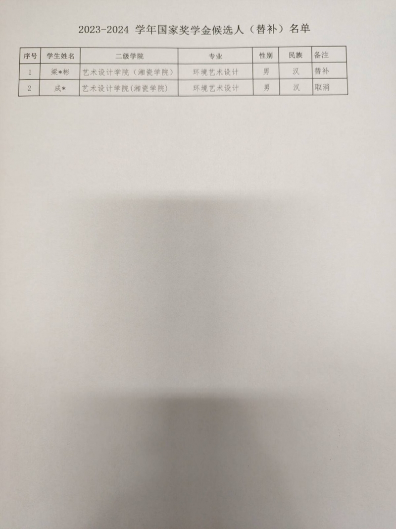关于2023-2024学年国家奖学金候选人(替补)的公示