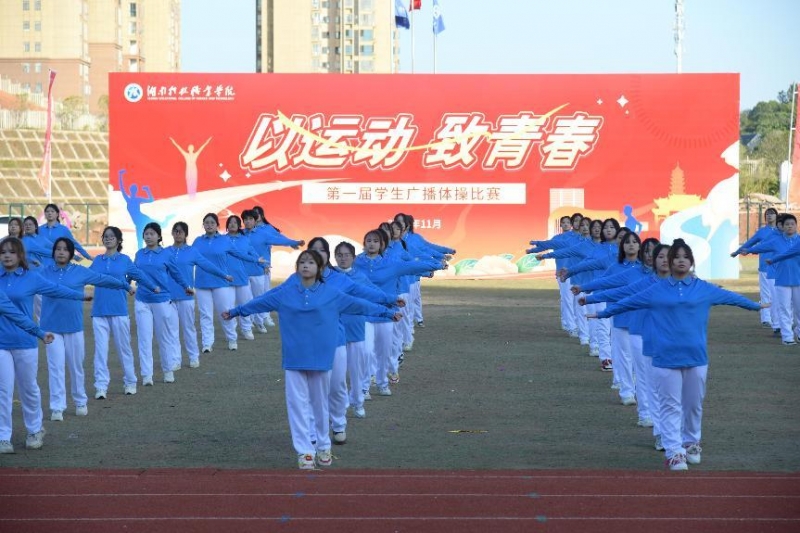 11月27日下午,我校第一届学生广播体操比赛在天心校区北院田径场成功举办。旨在更好地弘扬体育精神,丰富校园文化生活,展现我校学生的青春风采。学校党委书记杨翠明及分管校领导出席,相关部门及各二级学院相关负责人参加。党委委员、副校长彭波为本次比赛致辞,他鼓励同学们在比赛中积极拼搏,赛出风格。此次比赛以各二级学院为单位组队,每支队伍100人,在经过学院初赛选拔之后,7个二级学院的8支队伍共800余名师生参加决赛。