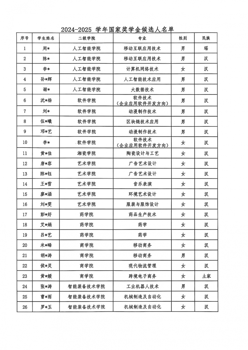 关于2024-2025学年国家奖学金候选人的公示