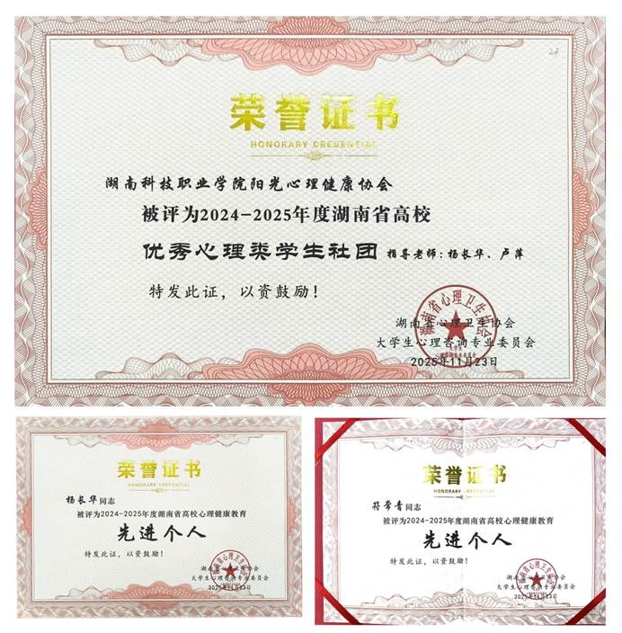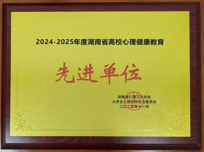 11月22日至23日,湖南省心理卫生协会大学生心理咨询专业委员会第二十届学术年会在长沙召开,全省高校分管学生工作的相关负责人、专兼职心理教师以及辅导员代表参加。本次大会对湖南省高校2024—2025年度先进单位和先进个人给予了表彰。我校荣获“2024—2025年度湖南省高校心理健康教育先进单位”称号,学校阳光心理健康协会被评为“湖南省高校优秀心理类学生社团”,杨长华、符常青2位老师荣获“湖南省高校心理健康教育先进个人”荣誉。