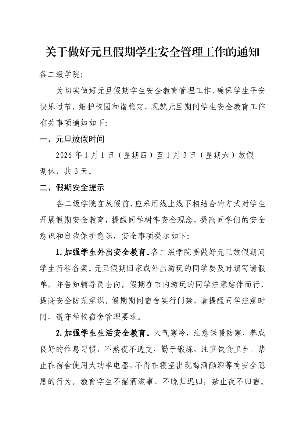 关于做好元旦假期学生安全管理工作通知