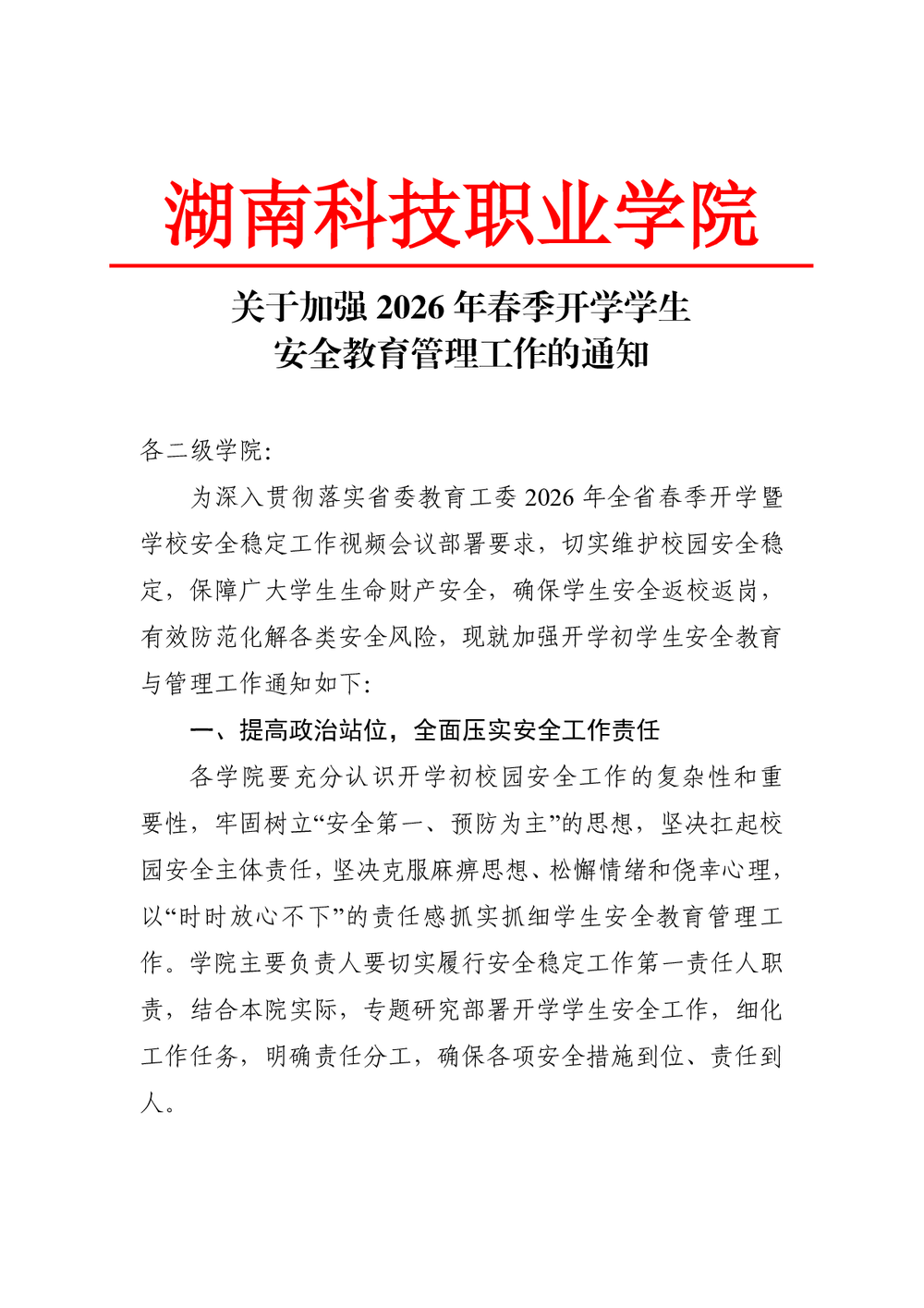 关于加强2026年春季开学学生安全教育管理工作的通知